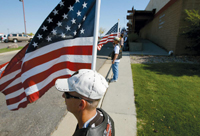 Jon Perkins of Cheyenne stands with an American flag with the 'Patriot Guard' in front of the Highland Park Community Church during a memorial service for Capt. Bruce Hays on Thursday afternoon in Casper. Hays was the first Wyoming National Guard soldier to be killed in Afghanistan. Photo by Dan Cepeda, Star-Tribune.